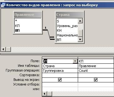 Таблица “Правление ” связана с таблицей “Страна ” с помощью поля “ВП ”, тип связи – один ко многим (одной записи в таблице “Правление ” может соответствовать несколько записей в таблице “Страна” ). Таблица “Национальность” связана с таблицей “Страна” с помощью поля “Национальность”, тип связи – один ко многим (одной записи в таблице “Национальность ” может соответствовать несколько записей в таблице “Страна” ).