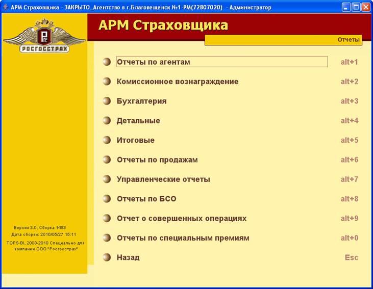 Система «АРМ Страховщика» была разработана специалистами компаний Росгосстрах и TopS BI и запущена в эксплуатацию в 2005 г. Система позволяет автоматизировать основные бизнес-процессы, связанные с операционной деятельностью страховой компании: ведение договоров страхования, урегулирование убытков по договорам страхования, учет бланков строгой отчетности, расчет страховых резервов, формирование оперативной и регламентной отчетности, учет агентов и расчет их комиссионного вознаграждения, учет поступлений и возвратов страховых взносов.