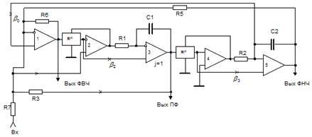 Для реальных ОУ в области достаточно высоких частот участок цепи от неинвертирующего входа ОУ2 до инвертирующего входа ОУ1 за счет напряжения рассогласования на входе ОУ1 вырабатывает такой сигнал обратной связи, который уменьшает изменения параметров устройства. Аналогично введенный контур действует и на собственный шум схемы, возникающий за счет ОУ1. Это объясняется тем, что коэффициенты передачи энергии шума от входа ОУ2 на выход ФНЧ имеют разные значения.