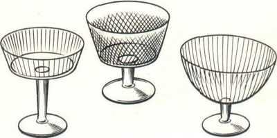 Десертные тарелки вполне можно заменить закусочными и малыми столовыми глубокими тарелками; креманки - металлические или стеклянные (рис. 4) - для многих сладких блюд (киселей, компотов, фруктов или ягод в сиропе, мороженого и др.). Креманки со сладкими блюдами перед подачей к столу ставят на пирожковые тарелки.