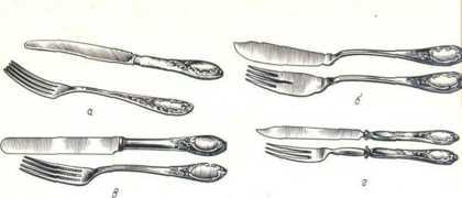 (рис. 5, б) необходимы для употребления блюд из рыбы. При отсутствии специальных приборов для рыбы пользуются двумя вилками. Нож и вилка для рыбы несколько меньше столовых. Нож для рыбы тупой, похож не удлиненную лопатку, а вилка имеет четыре укороченных и широких рожка.