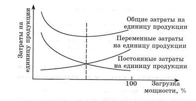 Необходимо, однако, помнить, что при работе установки на предельной загрузке увеличиваются производственные расходы на единицу продукции из-за повышенного износа установки и возрастающих затрат энергии. С уменьшением загрузки установки увеличиваются постоянные издержки, например, удельные амортизационные расходы. И то, и другое отражается на затратах на единицу продукции (рис.2.1.2.)