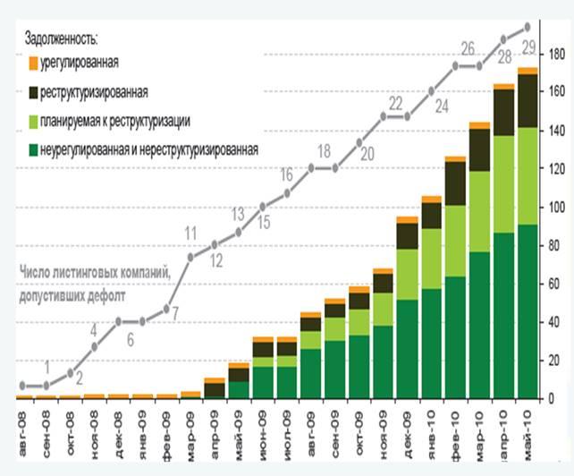 Общее количество эмитентов, допустивших дефолт по выпущенным ценным бумагам, по состоянию на 1 октября 2010 года – 36. Из них 27 компаний, ценные бумаги которых обращаются на фондовой бирже. Общая номинальная стоимость – 771 275 000 000 тенге. Задолженность погашена полностью по 4 эмитентам. Задолженность погашена частично по 8 эмитентам, ценные бумаги которых обращаются на фондовой бирже. [21, с. 6]