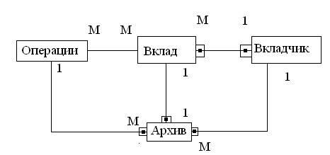 4. Архив - Вкладчик – с.с. М:1. Одна запись архива содержит одного вкладчика, а один вкладчик, поскольку может иметь несколько вкладов, может быть записан в архиве несколько раз.