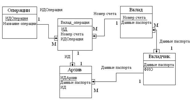 5. Операции - Архив – с.с. 1:М. Архив содержит закрытые вклады, то есть вклады, к которым применена операция Закрытие. Значит 1 операция соответствует многим (а именно всем) записям архива.
