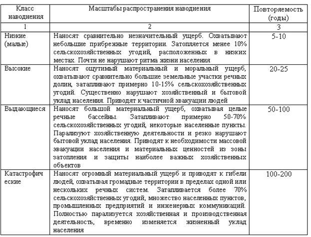 Классификация наводнений в зависимости от масштаба их распространения (таблица 5).
