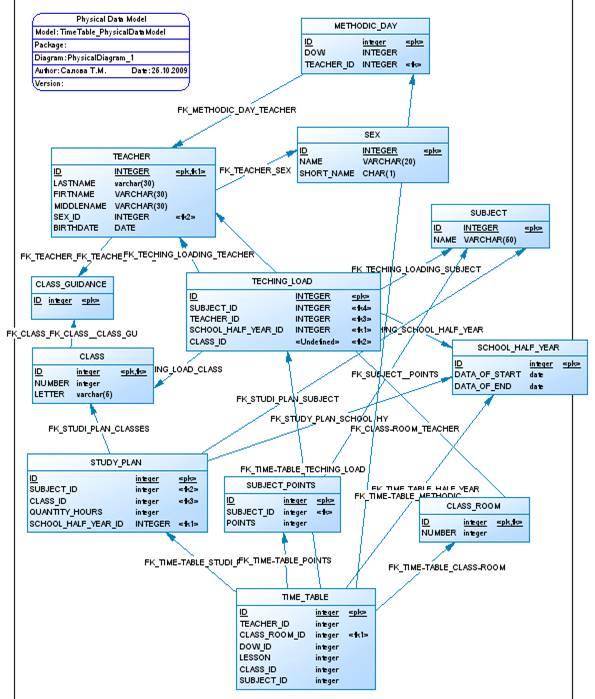 Во-первых, программа должна включать в себя следующие таблицы: учителя, предметы, методические дни, классное руководство, школьное полугодие, нагрузка учителя, список классов, список кабинетов, балловая оценка предметов, учебный план и само расписание. Эти таблицы и связи между ними решено было реализовывать в программе PowerDesigner. Для всех таблиц должна быть реализована возможность вносить изменения в имеющиеся данные, удалять их и добавлять новые. Необходимо создать справочную систему, доступную для неопытного пользователя, по эксплуатации данной программы. Для таблиц должна быть реализована возможность изменять данные, удалять и добавлять новые. Также необходима проверка вводимых данных на соответствие типу данных. Замечание по поводу начальных классов: для них предполагается прописывание только тех предметов, которые ведут другие учителя (не классный руководитель).