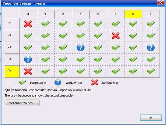ASCTimetable показалась мне довольно легкой в пользовании, хотя к ней необходимо привыкнуть, ведь она включает в себя очень много параметров, хотя не могу сказать, что среди них есть лишние. Для своей программы я позаимствовала несколько важных условий для создания расписания из ASCTimetable. Мне очень понравился интерфейс программы: очень яркий и наглядный.