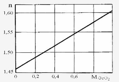 Рис. 9 Зависимость показателя преломления плавленого кварца от молярной доли оксида германия М(GeO2):Из большинства видов стекол самым низким поглощением в видимой области спектра обладает плавленый кварц - при условии высокой степени очистки и гомогенности (однородности по составу). Значительные преимущества кварца обусловлены малыми внутренними потерями на рассеивание. Высокая температура плавления кварца (1610 С при быстром нагреве, 1720 С при медленном), с одной стороны, требует специальной технологии для изготовления оптического волокна, а с другой - помогает избавиться от различных примесей, которые испаряются при более низких температурах. Стекла, применяемые для изготовления световодов (сердцевины и оптической оболочки), различаются показателями преломления n. В кварц (показатель преломления n = 1,4585 на длине волны 0,589 мкм) добавляется оксид бора (n = 1,4585 на длине волны 0,589 мкм), снижающий показатель преломления (рис.8). Полученный материал может быть применен в качестве оболочки оптоволокна. Длительный отжиг (термическая обработка стекла, придающая необходимые свойства) боросиликатного стекла приводит к увеличению n. Этот материал используется для изготовления сердечника. Другой способ понизить показатель преломления плавленого кварца - добавить в него фтор. В отличие от метастабильного характера изменения этого показателя у чистого боросиликата, снижение его у боросиликатного стекла с добавкой фтора - внутреннее свойство атомов фтора в матрице SiO2. Разность показателей преломления чистого SiO2 и материала с добавкой фтора увеличивается линейно с повышением молярной концентрации фтора вплоть до нескольких процентов. Показатель преломления кварца уменьшается на 0,2% при изменении молярной концентрации фтора на 1%. При этом оптические свойства кварца не ухудшаются. Фторирование кварца позволяет уменьшить рассеивание Рэлея и минимизировать волновые потери. Однако легирование фтором увеличивает вероятность возникновения трещин и уменьшает прочность стекла, а, кроме того, делает кварц более чувствительным к диффузии водорода. Все другие добавки к плавленому кварцу - такие, как GeO2 (рис.9), P2O5, TiO2, Al2O3, Sb2O3 приводят к увеличению показателя преломления по сравнению с чистым кварцем без ухудшения его оптических свойств. Молярные доли этих оксидов в кварце могут меняться в пределах от 1 до 15%. Показатель преломления увеличивается на 0,001 при увеличении молярной доли GeO2 на 1%. При 20-процентной молярной концентрации двуокиси германия показатель преломления увеличивается на 1,5%. Кварц с добавкой германия, который может быть использован в качестве материала сердцевины оптоволокна , имеет широкое окно прозрачности почти до 1,7мкм (рис.5). Более предпочтительным в качестве легирующего материала (как более дешевого) является фосфорный ангидрид Р2О5. При добавлении к плавленому кварцу Р2О5 для образования бинарного стекла внутреннее поглощение материала и рэлеевское рассеяние увеличиваются весьма незначительно. Фосфорный ангидрид сублимируется (переходит из твердого состояния в газообразное, минуя жидкое) при температуре 300 С , гигроскопичен (способен поглощать влагу из воздуха) и имеет температурный коэффициент линейного расширения почти в 25 раз больше, чем у плавленого кварца. Однако он образует с кварцем устойчивое бинарное стекло,