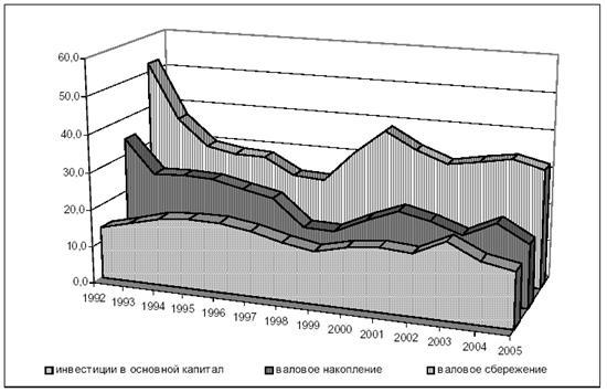 Рис. 2.2. Доля валового сбережения валового накопления и инвестиций в основной капитал в ВВП в 1992–2005 гг. (%)