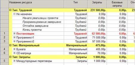 Стоит также отметить, что в системе отлично реализовано управление ресурсами и их отслеживание. Ресурсы представлены тремя видами: затратные, материальные и трудовые.
