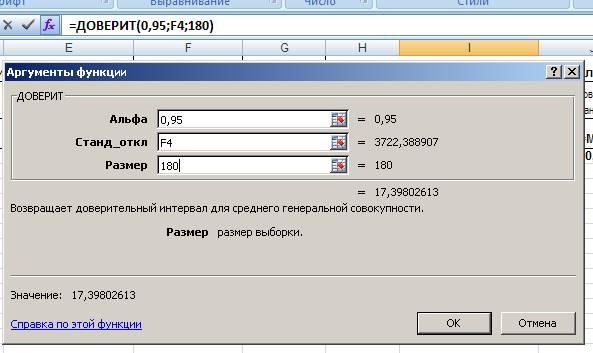 Рис. 39. Ввод формулы разности значений функции распределения в начале и конце интервала.