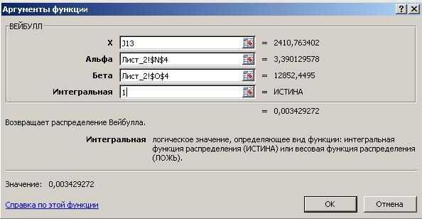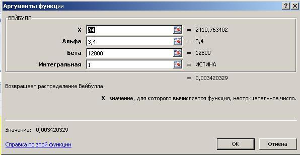 Рис. 38б. Ввод аргументов функции ВЕЙБУЛЛ().