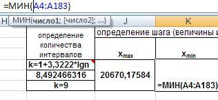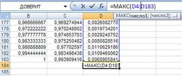 Для этого введем в ячейку D4 формулу для абсолютной разности f* и F, распространим на весь диапазон D4:D183. Затем в ячейке D184 найдем максимальную разность.