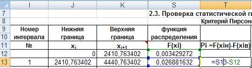 Распространим формулу на остальные интервалы автозаполнением. В следующем столбце, в ячейку S13 введём формулу для расчета разности значений функции распределения в начале и конце интервала (рис.39). И распространим её на все интервалы.