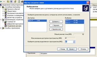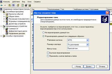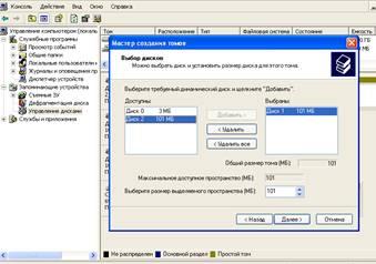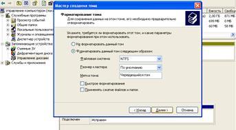 Создайте на первом добавленном винчестере (“диск_1”) простой том объемом около 60-70 Мб и отформатируйте его в системе NTFS.
