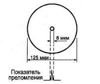 Типы и размеры волокон приведены на рисунке 1. Каждое волокно состоит из сердцевины и оболочки с разными показателями преломления. Сердцевина, по которой происходит распространение светового сигнала, изготавливается из оптически более плотного материала. При обозначении волокна указываются через дробь значения диаметров сердцевины и оболочки. Волокна отличаются диаметром сердцевины и оболочки, а также профилем показателя преломления сердцевины. У многомодового градиентного волокна и одномодового волокна со смещенной дисперсией показатель преломления сердцевины зависит от радиуса. Такой более сложный профиль делается для улучшения технических характеристик или для достижения специальных характеристик волокна.