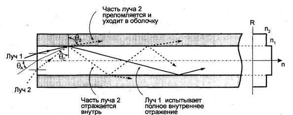 ). На рисунке 2 показан ход лучей в таком волокне. Так как сердцевина является оптически более плотной средой по отношению к оболочке (n