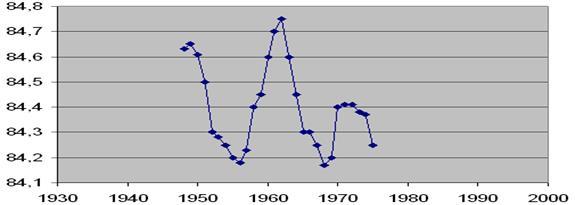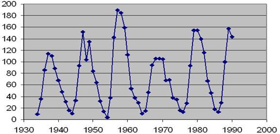 Как видно из графика солнечная активность имеет определенную зависимость, проявляющуюся в совершенно чётком 11-летнем цикле солнечной активности.