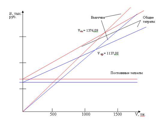 Из полученных результатов можно сделать вывод, что критический объем реализованной продукции в 2009г. составит 1137,08 тн. или 128004,69 тыс.руб. Предприятие не будет в убытке от реализации автопружин, если будет производить их с постоянными затратами не более 88 642,12 тыс.руб., переменными затратами на 1 тн. не более 73,21 тыс.руб. и по цене не менее 96,11 тыс.руб.