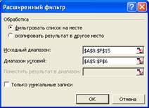 будет автоматически занесен диапазон ячеек, занимаемых исходной таблицей. Для занесения диапазона ячеек, занимаемых вспомогательной таблицей, в поле Диапазон условий