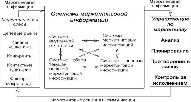 Поток информации, поступающей к управляющим по маркетингу, помогает им в проведении анализа, планирования, претворении в жизнь и контроля за исполнением маркетинговых мероприятий. Обратный поток в сторону рынка состоит из принятых управляющими решений и прочих коммуникаций.