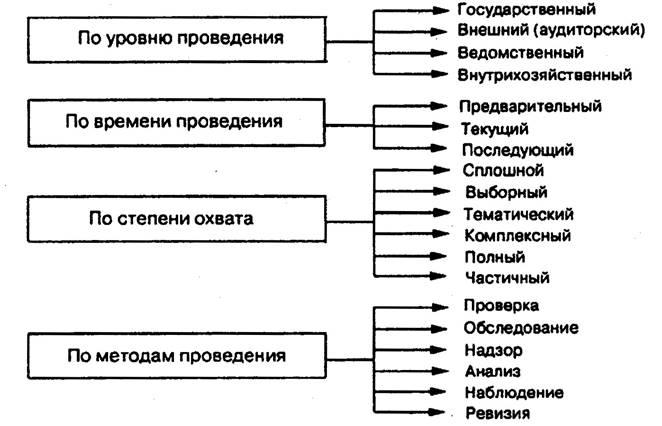 Аудит делится на банковский, аудит внебюджетных, инвестиционных фондов и бирж, аудит страховых организаций и общий аудит. Хозяйствующие субъекты могут проводить аудит своими силами — внутрифирменный аудит.