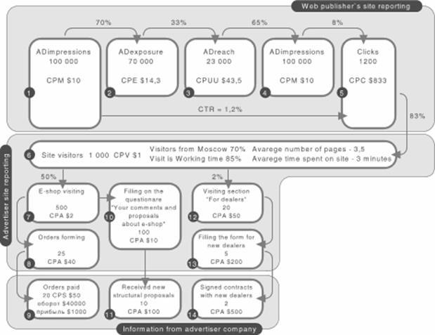 2. Исходя из данных веб-издателя мы знаем, что в среднем за эту неделю пользователь посетил сервер 3 раза (100 000 посещений главной страницы, 33 000 уникальных пользователей). Следовательно, нашу рекламу пользователь в среднем видел 3 раза. Получаем, что Adfrequency = 3, а Adreach = 23 000 (количество уникальных пользователей, которым была показана реклама: 70000/3). Получается, что стоимость контакта с тысячью уникальных пользователей составила CPUU = 43,5 доллара (cost per unique user), что, как показал сравнительный анализ, на 8% меньше, чем в среднем по всей рекламной кампании.