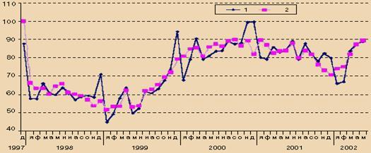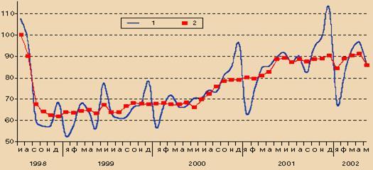 Спад в инвестиционной сфере в ходе затянувшегося трансформационного кризиса в России был наиболее глубоким и драматическим. Если в 1998 г., когда снижение производства было наибольшим, ВВП, согласно официальной статистике, составлял 61%, объем промышленного производства - 50% по отношению к уровню 1991 г., то инвестиции в основной капитал достигали только 25%, в том числе прямые инвестиции производственного назначения - всего лишь 15% от уровня 1991 г.
