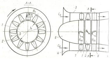 тель 6 снижает удары воздушного потока о лопатки; диффузор 5 преобразовывает динамический напор в статический. Для регулирования производительности и давления перед рабочим колесом устанавливают направляющий аппарат 7. Для раскручивания воздушного потока за рабочим колесом устанавливают спрямляющий аппарат 8, конструктивно представляющий собой неподвижное колесо с лопатками обтекаемой форм, устанавливаемыми под углом О
