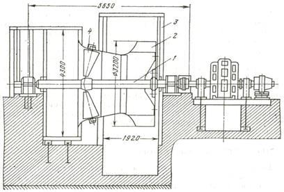 При нормальной работе вентилятора воздух из шахты, как показано сплошными стрелками, поступает по вентиляционному каналу 1 к вентилятору
