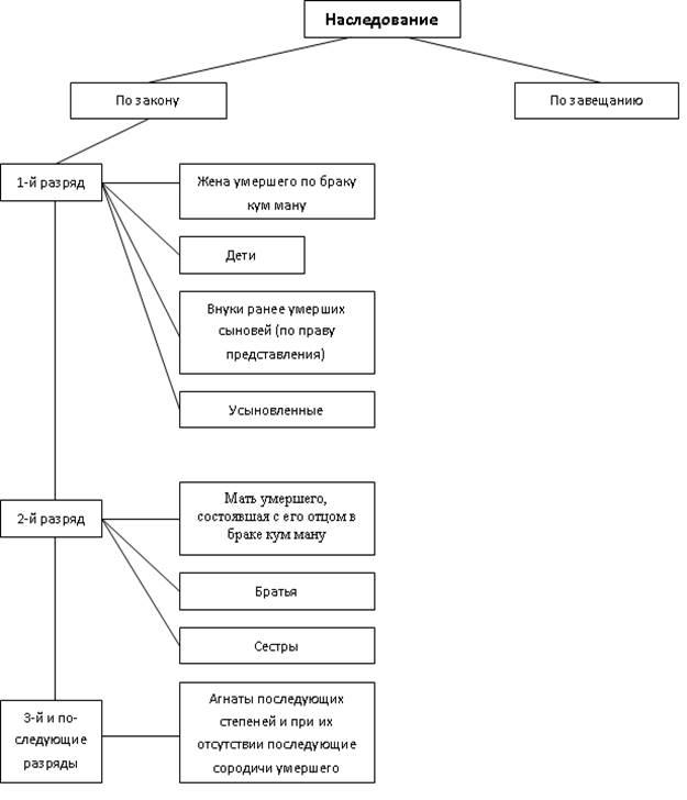 . Законы XII таблиц знали два основания наследования: наследование по завещанию и наследование по закону, которое имело место, если наследодатель умирал, не оставив завещания. При отсутствии завещания имущество умершего переходило к наследникам по закону. Система наследования, существовавшая в эпоху Законов ХП таблиц, исходила из семейной общности имущества и агнатического родства (от лат. agnatus – родственник по отцу). Наследниками по закону могли быть только члены семьи (Рис.3)