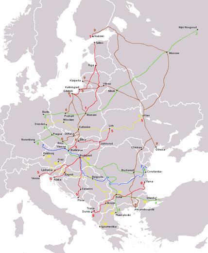 2-я Панъевропейская конференция министров транспорта по девяти коридорам Трансъевропейских сетей и основные пути взаимодействия стран. |