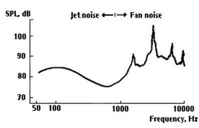 Figure 7.2. shows a typical farfield SPL noise spectrum generated by a turbofan engine at a landing-approach power setting. Below 800 Hz, the spectrum is controlled by noise from the primary jet exhaust. The spectrum between 800 and 10000 Hz contains several discrete frequency components in particular that need to be attenuated by the linings in the inlet and the fan duct before they are radiated to the farfield.