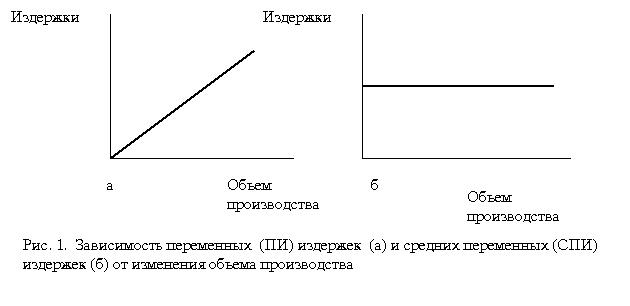 К переменным обычно относят затраты на сырье и материалы, топливо, энергию, транспортные услуги, часть трудовых ресурсов, т.е. те издержки, уровень которых изменяется с изменением объема производства (рис. 1а).