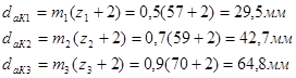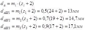 б) диаметры вершин зубьев шестерен и колес: