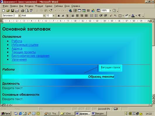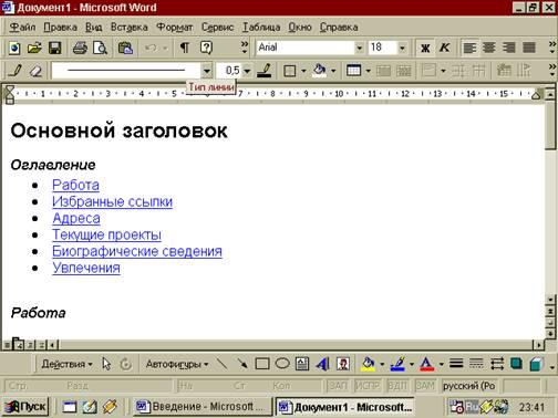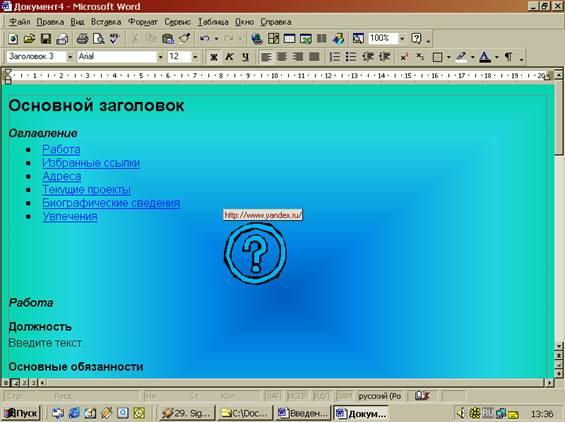 Там предложено несколько вариантов разметки страницы (личная основная страница, оглавление, обзор, регистрационная форма и т. п.), и стилей цветового оформления, из которых всегда можно выбрать подходящий. Эти шаблоны могут многому научить пользователя. Microsoft Word позволяет открывать готовые HTML-документы. Так же когда сохраняют документы Интернет c помощью средства просмотра ресурсов (Microsoft Internet Explorer), надо выбирать формат HTML. Это поможет сохранить форматирование и использовать его в своей дальнейшей работе. Лучший инструмент редактирования этих документов на рабочем месте - Microsoft Word 97.