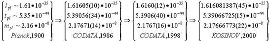 Каждая группа математических соотношений, приведенных выше, дает практически одинаковые значения lpl, tpl, mpl.Ниже приведены результаты расчета значений констант lpl, tpl, mpl, полученных по приведенным формулам. При расчетах использовались новые значения гравитационной константы G
