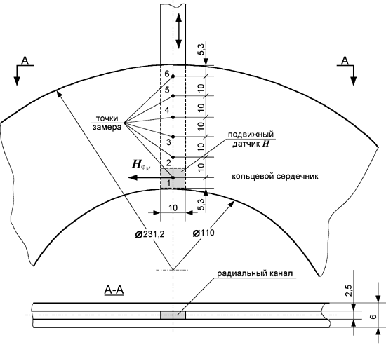, совпадающих с осями магнитной анизотропии материала, были предусмотрены радиальные каналы, позволяющие передвигать датчик напряженности вдоль радиальной координаты и осуществлять измерения касательной составляющей напряженности Нj