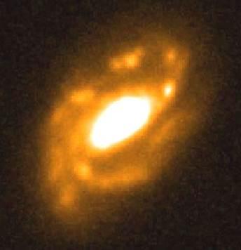 (Рис. 12), расположена на расстоянии около 6 миллиардов световых лет от нас (величина красного смещения равна 0,58). Ее масса более чем в 1000 миллиардов раз больше массы Солнца. Таким образом, эта галактика примерно в четыре раза массивнее нашей Галактики и вдвое — самой массивной спиральной галактики из известных до сих пор.