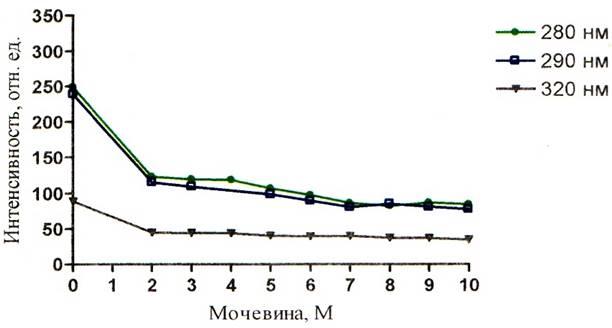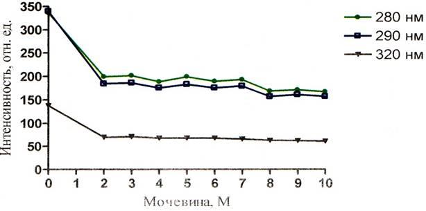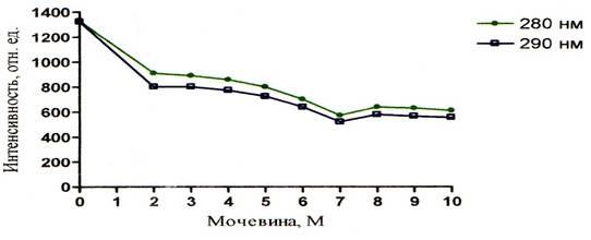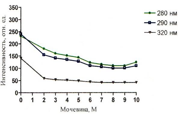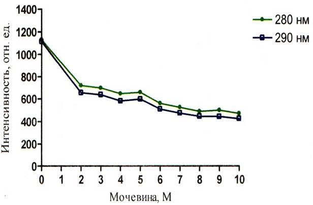 При изучении зависимости ИФ собственной от рН среды, взглянув на графики рисунков 5 – 7, можно сделать вывод о том, что ИФ при концентрации мочевины, равной нулю, в щелочной среде намного ниже, чем значения ИФ для кислой и нейтральной среды. Этот факт обусловлен тушением флуоресценции триптофана. Причиной тушения флуоресценции в щелочной среде может являться миграция энергии с триптофанила на ионизированный тирозинил.