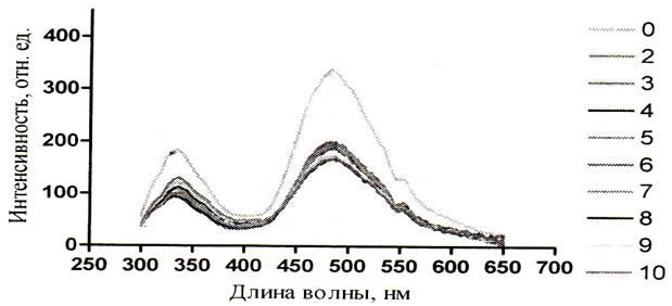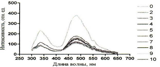 Рисунок 13 – Спектры зондовой флуоресценции альбумина (280 нм) при действии на него мочевиной (2 – 10М) при рН 9,08 [48]