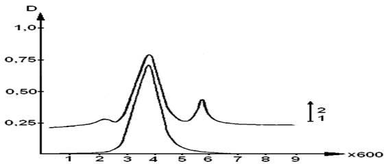 1 - исходная мономерная фракция сывороточного альбумина; 2 - мономерная фракция альбумина с СuSO4