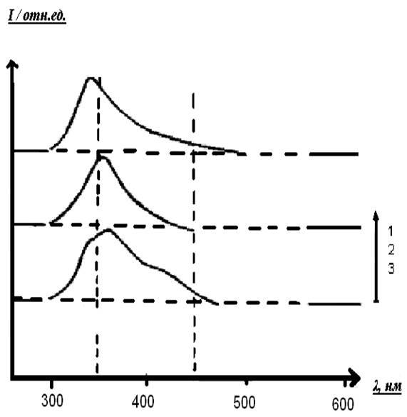 1 - димер, 2 - мономер (исходный белок), 3 - белковая фракция с массой меньшей, чем исходный мономер, длина волны возбуждения 290 нм.