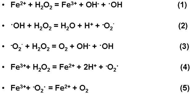 Свободные радикалы в эксперементе образовывались по реакции Вейсса – Габера, суть которой заключается в том, при, что при действии металла переменной валентности, являющегося одноэлектронным донором, на пероксид водорода, образуются свободные радикалы. Реакция Вейсса – Габера состоит из нескольких стадий, показанных на рисунке 17.