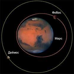 к ней. Период обращения Фобоса вокруг Марса 7 ч. 39 мин., для Деймоса 30 ч. 21 мин.