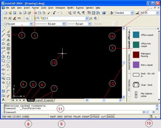 Рис. 1- Элементы пользовательского интерфейса: 1 —строка меню, 2 — панели инструментов, 3 — панель Tool Palettes, 4 — пиктограмма осей координат, 5 — кнопки показа списка вкладок, 6 — вкладка пространства модели, 7 — вкладки листов, 8 — строка состояния со счетчиком координат, 9 — кнопки режимов, 10 — Communication Center, 11 — зона командных строк, 12 — курсор, 13 — линейки прокрутки, 14 — кнопки управления окном документа