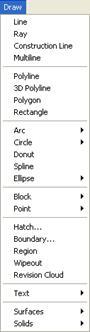 Включает команды черчения большинства примитивов системы. Почти все позиции имеют подменю второго уровня и даже третьего. Содержит пункт для работы с блоками, штриховкой, текстом и трехмерными объектами. |