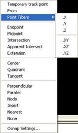 Это меню по своим функциям очень похоже на панель инструментов Object Snap (Объектная привязка). Дополнением является лишь пункт Point Filters (Координатные фильтры), который позволяет воспользоваться одним из шести вариантов координатных фильтров: .X, .Y, .Z, .XY, .XZ, .YZ. Функция координатного фильтра чаще всего используется в трехмерных построениях. Она позволяет взять одну или две координаты из какой-нибудь точки рисунка и затем задать остальные координаты. Например, если для следующей точки (скажем, конца отрезка) нужно взять абсциссу от другой точки, то следует в ответ на запрос точки ввести на клавиатуре .X (или выбрать одноименный пункт контекстного меню). Дальше системе AutoCAD необходимо указать точку любым из известных вам способов, у которой будет вычислена абсцисса, а затем по следующему запросу системы (need YZ): ((требуется YZ):) ввести на клавиатуре оставшуюся координату (или оставшиеся координаты, если речь идет о трехмерной точке).