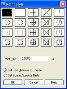 Интересным примитивом системы AutoCAD является точка. Для его построения используется команда POINT (ТОЧКА), которая, помимо набора на клавиатуре, может быть вызвана из панели Draw (Рисование) с помощью кнопки или из падающего меню, если применить команду Draw | Point | Single Point (Рисование | Точка Одиночная). Построенные заранее точки могут затем быть использованы другими командами. Команда POINT (ТОЧКА) при вызове ее из панели инструментов Draw (Рисование) работает в цикле, выдавая вопрос: Current point modes: PDMODE = 0 PDSIZE = 0.0000 Specify a point: (Текущиережимы точек: PDMODE = 0 PDSIZE = 0.0000 Укажите точку:) Укажите с помощью мыши точку на экране. В указанном вами месте образуется точка, изображаемая в соответствии с теми установками, которые вам выдала система AutoCAD (это значения системных переменных PDMODE и PDSIZE; подробнее о работе с системными переменными см. в разд. 11.1). Дальше AutoCAD снова выдает вышеприведенный запрос об указании точки, и вы можете задать следующую точку и т. д. Когда вам нужно прервать команду POINT (ТОЧКА), то следует воспользоваться клавишей <Esc>. Если системные переменные PDMODE = 0 и PDSIZE = 0, то точка отображается в виде одного пиксела (т. е. одной точки экрана), что чаще всего неудобно. Поэтому в падающем меню Format (Формат) есть пункт Point Style (Отображение точек), который вызывает диалоговое окно Point Style (Отображение точек) (рис. 11).